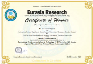 За результатами участі у конференції, проф. Л.Е. Гризун була відзначена Certificate of Honour як Online Keynote Speaker за технічну презентацію та науковий внесок у дослідження “Petri Net-Based Modelling for the Design of Coordinated University Curriculum”. Нагороду вручено в межах заходу, організованого Scientific & Technical Research Association (STRA).